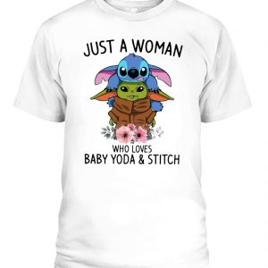 Just A Woman Who Loves Baby Yoda And Stitch Shirt